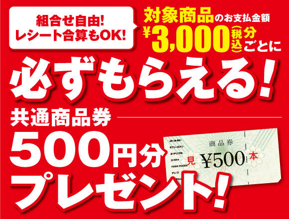 対象商品のお支払い金額3,000円(税込)分ごとに、共通商品券500円分プレゼント!